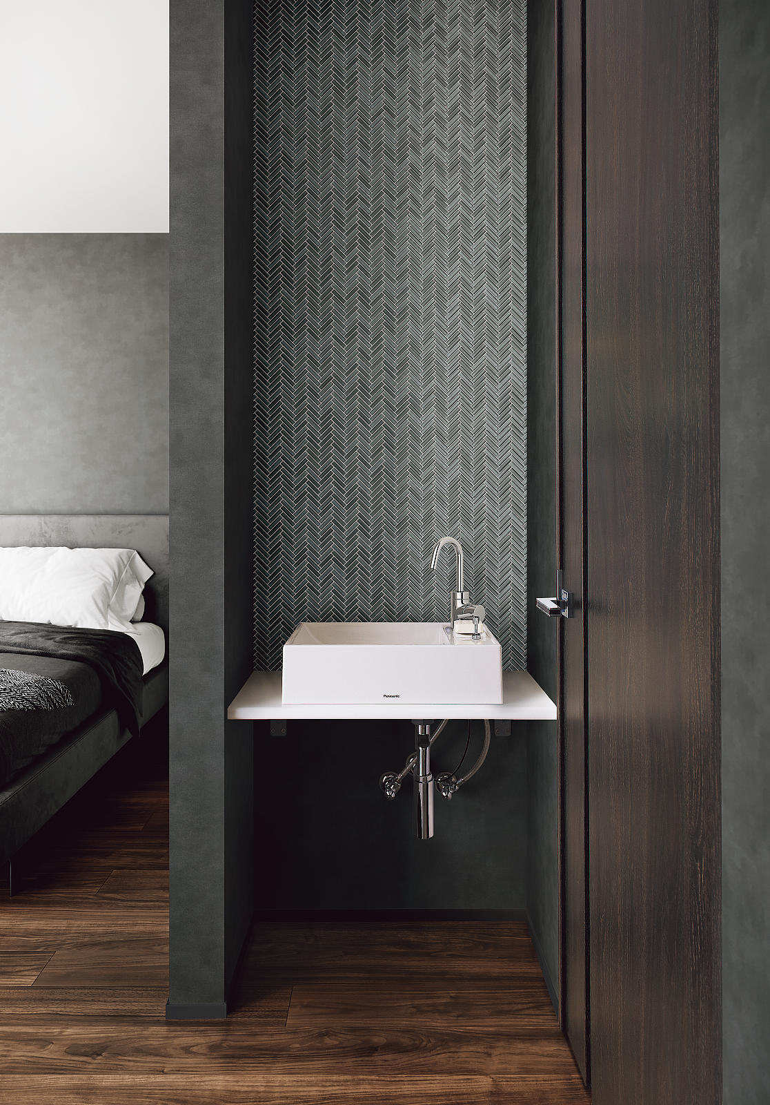 寝室にあって意外とうれしいのは、コンパクト洗面台。