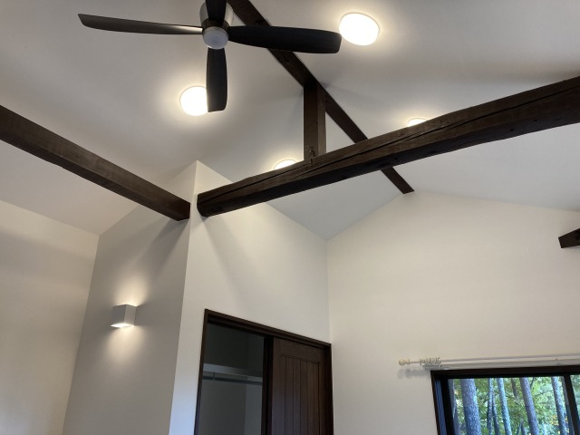 暖房機器はガスストーブと薪ストーブ、床暖房を併用。天井が高くなったのでシーリングファンを設置しました。